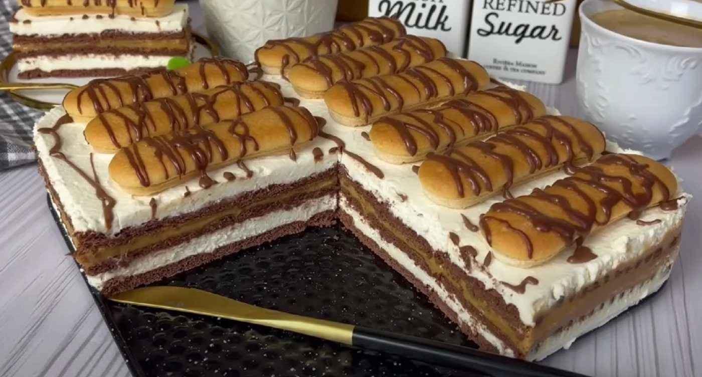 Rychlý dezert bez pečení, který zvládnete za pár minut. Vrstvy kakaových sušenek, nadýchaný krém z mascarpone a šlehačky, uprostřed sametový kajmak (karamelizované kondenzované mléko) a na vrchu namočené cukrářské piškoty s čokoládovou polevou. Stačí dát přes noc vychladit a máte hotový slavnostní zákusek.