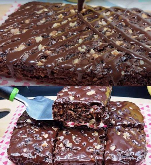 Vymažte zapékací misku máslem a nalijte do ní těsto. Do těsta vložte vlašské ořechy a posypte čokoládovými lupínky.
