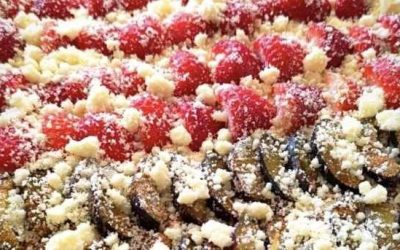 Recept na letní litý koláč se zakysanou smetanou, švestkami a jahodami s křupavou drobenkou – jednoduché ingredience, rychlý postup, celkový…