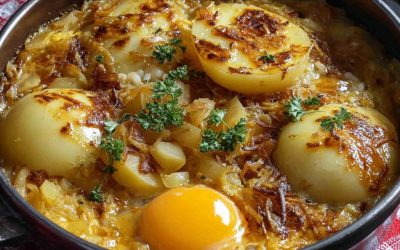 Zimní bramborový pekáč s karamelizovanou cibulí a měkkými vejci
